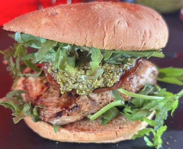 Chicken Burger mit Tomate, Mozzarella und Pesto